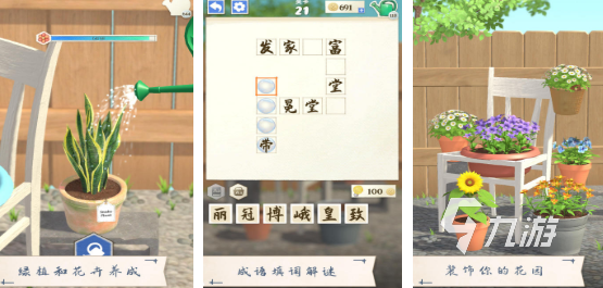 成語玩法簡單,玩家只需將下方提供的漢字移到正確的空格即可。每一步都會(huì)讓玩家得到金幣,玩家需要在每一個(gè)成語關(guān)卡解謎活動(dòng)中拼成所有的正確成語。在金幣的使用上,玩家可以購買各式各樣的盆栽以及小花,它們可以用來裝飾玩家的花園。玩累了成語游戲,玩家還可以在花園里對(duì)花進(jìn)行澆水。