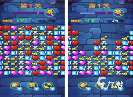 這款消除類型的是融入了地牢設(shè)計(jì)風(fēng)格的,當(dāng)你置身于充滿著黑暗的地牢世界以后,可通過點(diǎn)擊相同物品的方式進(jìn)行消除。既有紅色的小星,還有粉色的寶石等,正確的點(diǎn)擊里面的圖案,幫助玩家獲得分?jǐn)?shù),達(dá)到了沒關(guān)所設(shè)置的目標(biāo)分?jǐn)?shù)以后你就能順利通關(guān)。還有很多的道具,利用收集的方式幫助自己獲得更高分?jǐn)?shù)。