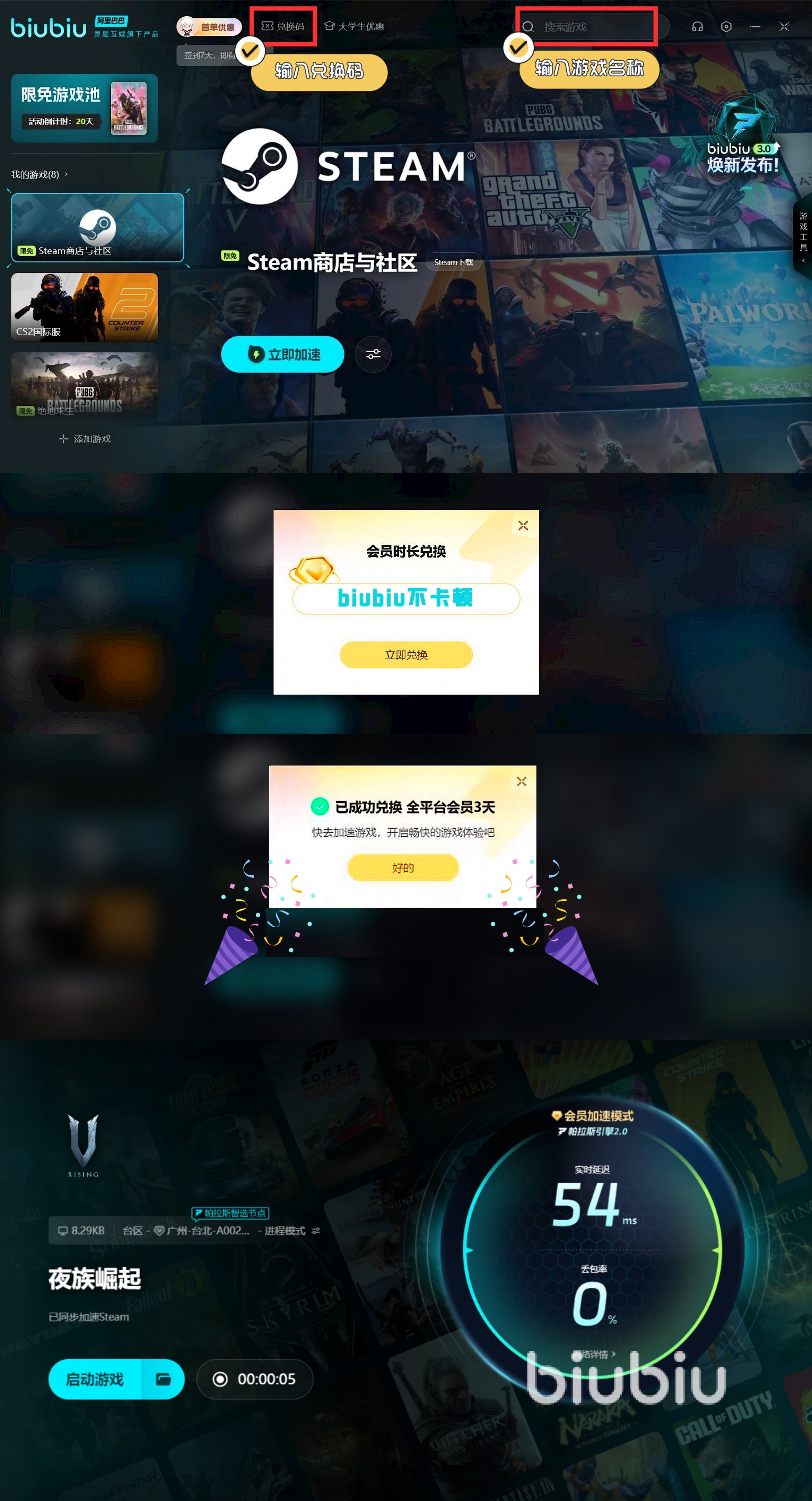 若是玩家想要去解鎖更多加速時長,那么到時候還可主動來點擊兌換,然后在其中輸入【biubiu不卡頓】,如此所有平臺用戶均可領(lǐng)取到72h的加速時長哦。