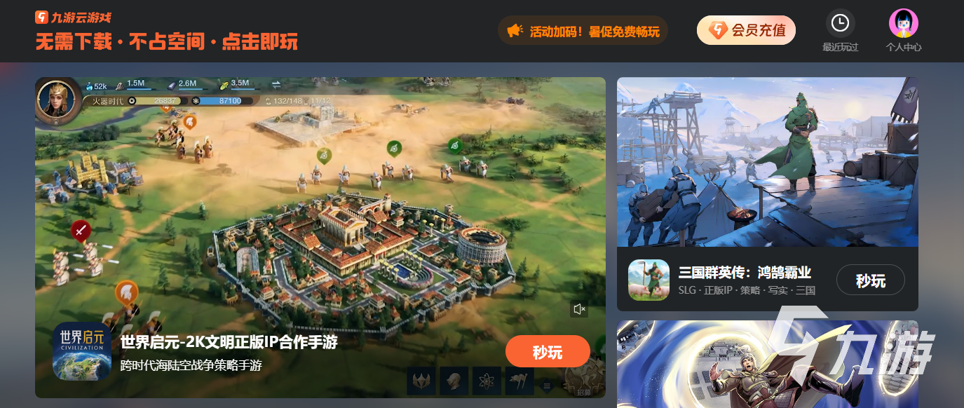 我們可以利用九游的云游戲功能,輕松的玩到這款游戲,正好現(xiàn)在有活動,千萬不要錯過哦。新用戶首次登錄之后,直接就領(lǐng)到免費的7天試用時間的,另外每天要是登錄了游戲,還會獲贈20分鐘使用時長。當玩家對任意一款游戲進行充值的時候,還會獲得2天的贈送時長哦。
