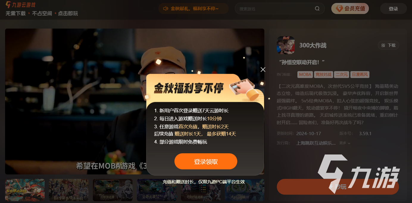 對于初次接觸300大作戰(zhàn)的玩家來說,九游云游戲平臺提供了豐厚的福利。首先,注冊成為新玩家即可享受7天的免費試用時長,無需任何成本便可暢玩各類游戲。每天登錄平臺還能額外獲得10分鐘的游戲時間,累計下來你每天都能免費體驗。更讓人心動的是,首次充值還可以獲得額外2天的游戲時長,給足了玩家福利,性價比相當高。對于那些不想過多投入的玩家來說,這樣的福利無疑是極具吸引力的。