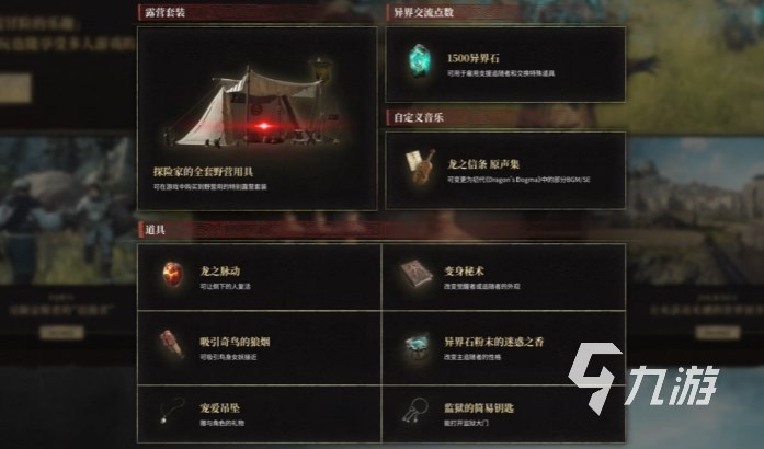 這包括一個(gè)露營(yíng)帳篷皮膚,可以復(fù)活倒下人員的龍脈,吸引女妖的狼煙,送角色的吊墜,改變外觀的秘術(shù),改變追隨者性格的迷惑香,開(kāi)監(jiān)獄的鑰匙,1500異界石,可以將游戲內(nèi)部分BGM改為初代版本的原聲集,這些加一起僅多出50元。