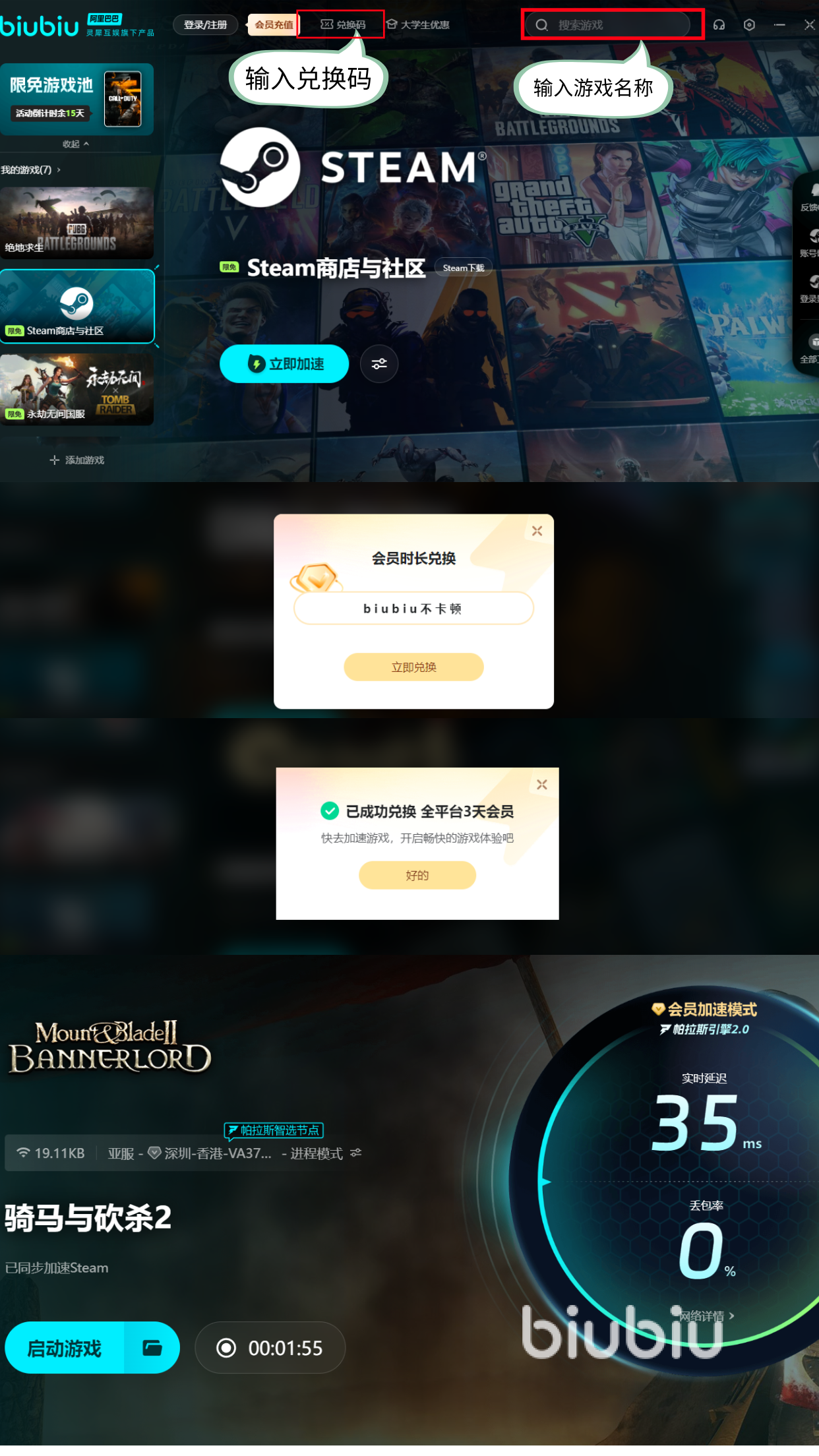 在玩兒的時候,如果大家擔(dān)心自己會遇卡頓,閃退等情況影響大家的海上作戰(zhàn)的話可以搭配加速器,比如上方給大家分享的這個,新用戶登錄注冊立刻就有24小時免費加速時長,此外每個小伙伴還可以額外領(lǐng)取三天免費時間,不過需要在指定區(qū)域輸入【biubiu不卡頓】兌換。
