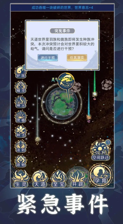 同時,在培養(yǎng)過程當中,還會遇到各類型突發(fā)事件。例如我們所培育世界當中兩個大種族之間即將爆發(fā)種族沖突,而該次沖突預計會對世界積累造成重大的影響。玩家們可以對此次事件進行干預或任其演化,干預則會損耗一定的靈氣,等等代價來制止事件。而任其演化則會出現(xiàn)一些意料之外的事情,這一切都看各位玩家們自己的選擇。