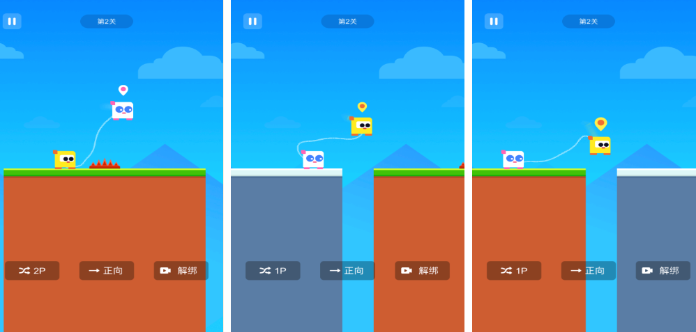 兩人一起操控小人通過關卡,小人的形象可在人物系統(tǒng)中進行挑選。關卡的道路只有一條,兩人需要一前一后行走,在不同的地點會有斷崖處。在道具方面,為了使兩人配合更加密切,一根繩子會將兩人的小人緊緊相連。功能設定齊全,玩家可縮小和放大觀察中的景象,在必要的時候,玩家還可以解綁兩人之間的繩子。