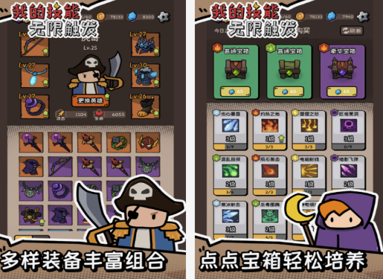 除了可以享受魔性割草般的快感,它也屬于在肉鴿游戲當(dāng)中,玩法比較簡單,支持技能無限觸發(fā)。冒險(xiǎn)的時(shí)候玩家會(huì)遇到很多的小怪,甚至是首領(lǐng)。通過化身為英雄角色以后,不斷的觸發(fā)自己的各種技能,培養(yǎng)厲害的英雄。其中的諸多寶箱,利用手指點(diǎn)一點(diǎn)的方式,就能完成對角色的培養(yǎng),多種裝備可以進(jìn)行豐富的組合。