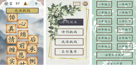 我國(guó)的古詩(shī)詞文化非常重要,也源遠(yuǎn)流長(zhǎng),但是在孩子們學(xué)習(xí)的過(guò)程中,可能會(huì)覺(jué)得非??菰?。從這些古詩(shī)詞中,就可了解到古代詩(shī)人的文化背景,在游戲中將小學(xué)生所有的古詩(shī)詞全部掌握,選擇了自己喜歡的難度等級(jí)之后,即可完成相應(yīng)的任務(wù)挑戰(zhàn),比如在屏幕上會(huì)看到相應(yīng)的古詩(shī)詞上句,而下一句卻需要你正確填入。