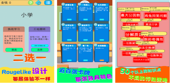 各種學(xué)生時(shí)代所學(xué)的知識(shí)在這里全部展現(xiàn),比如小學(xué)或者是大學(xué)等等。只不過(guò)這些知識(shí)都以卡牌的形式展現(xiàn),通過(guò)逐漸挑戰(zhàn)的方式學(xué)習(xí)到更多的知識(shí)點(diǎn),包括了雞兔同籠的問(wèn)題,或者是乘法口訣等。所有的知識(shí)點(diǎn),逐漸挑戰(zhàn)的方式來(lái)輕松積累,還有40多種不同的妙計(jì),突破更多難關(guān)。