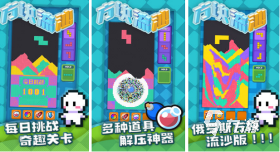 流動俄羅斯方塊,將經(jīng)典的俄羅斯方塊內(nèi)容融入其中,掉落之后會變成流沙,處于流動狀態(tài)。玩家要根據(jù)俄羅斯方塊的流動性,讓相同顏色沙子連接在一起,然后消除,這樣才能夠獲得更高的分?jǐn)?shù)。有相當(dāng)獨特的操作方式,也有連續(xù)消除機制,每次連續(xù)消除,不僅能夠觸發(fā)特效,也能夠獲得更高的分?jǐn)?shù)。