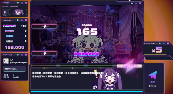 該游戲融合了音樂節(jié)奏以及怪文書主題,在這個(gè)音樂世界里,某個(gè)家里蹲的少女吸食了電波歌曲之后上網(wǎng)激情輸出萌萌怪文書,于是嗨翻天際的腦電波晃得整個(gè)世界暈頭轉(zhuǎn)向。