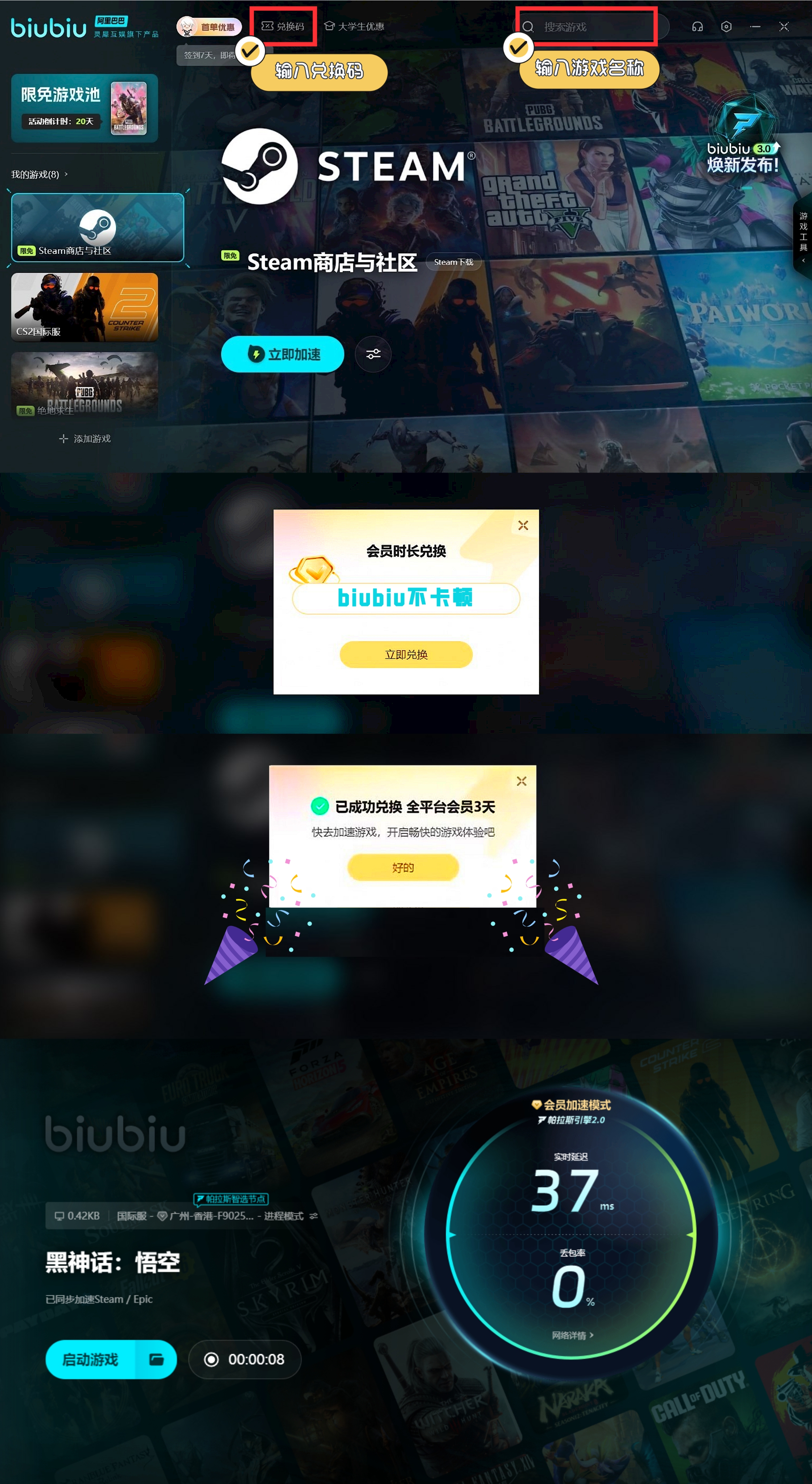 舌嘗思這個角色正是這個世界中一抹獨特的色彩,她的存在讓整個故事更加豐富和立體,那么大家在體驗這個游戲的時候,如果出現(xiàn)卡頓的情況,建議大家利用biubiu加速器這樣的工具確保玩家的游戲體驗更加流暢無阻?,F(xiàn)在新用戶注冊后不僅能享受24小時的免費加速服務(wù),還有額外的兌換碼【biubiu不卡頓】讓玩家再添三天免費時長,總共可達(dá)96小時的免費加速體驗,讓玩家的西游之旅更加順暢無阻。
