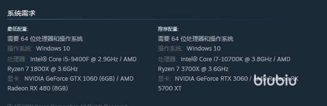 首先分享最低配置,操作系統(tǒng)Win10,處理器建議使用core i5-9400f以及ryzen 7 1800X。推薦geforce gtx 1060 (6GB),或者radeon rx 480 (8GB)。如果大家想要正常體驗這款游戲,最好最低配置都能達(dá)到上述要求。