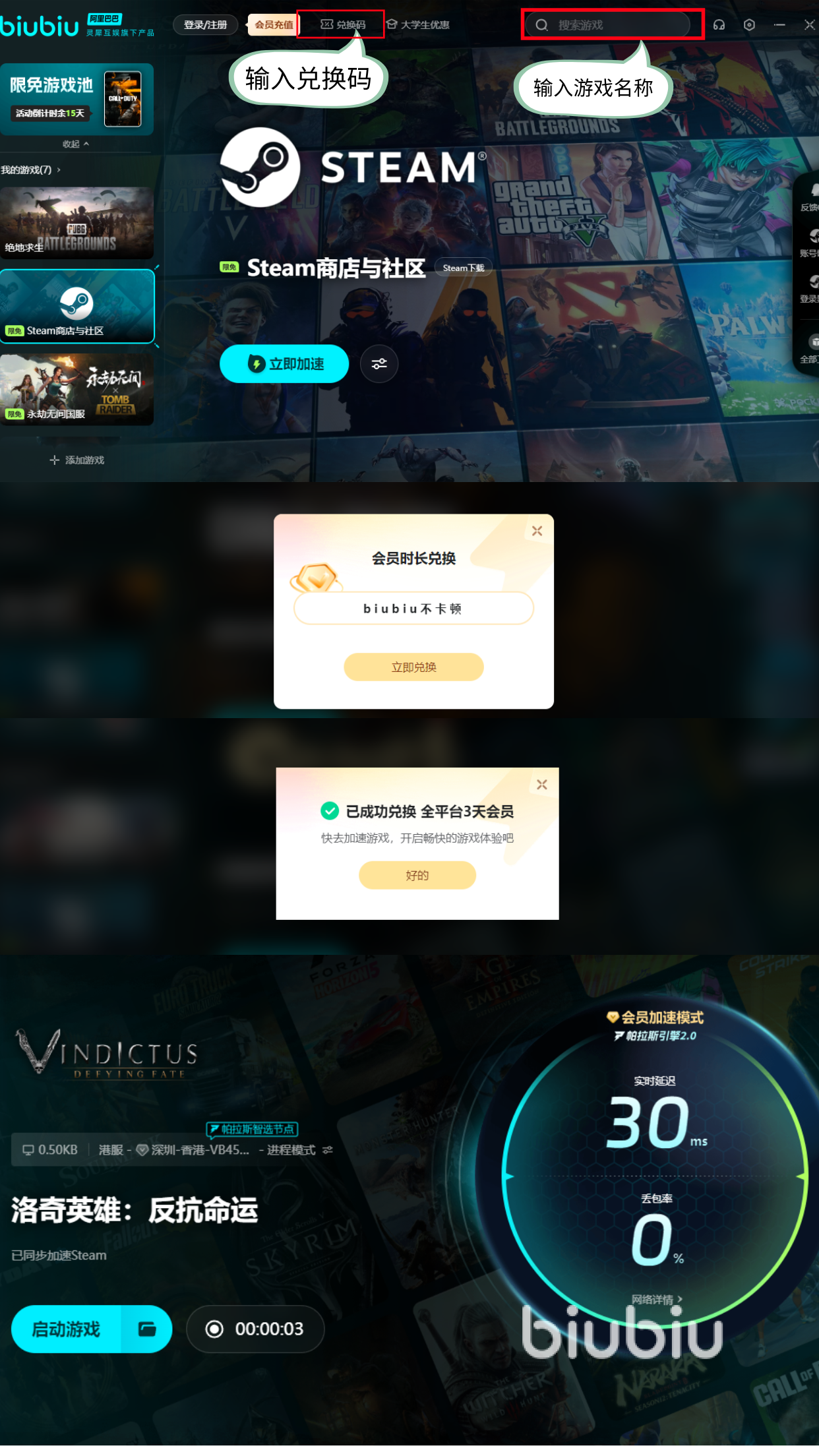 新用戶登錄注冊立刻就可以得到平臺贈送的24小時體驗時長,除此之外還可以用兌換口令【biubiu不卡頓】換取三天體驗時間,每個用戶都可兌換一次。