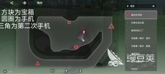 在高臺(tái)住宅地,玩家就需要注意建筑的角落,這里有一些代表寶箱的方塊標(biāo)記,還有一些代表手機(jī)的圓圈印記。目前顯示完成度是0/2,玩家就需要去仔細(xì)的搜索??兆鹘涣鞴珗@這邊就會(huì)有眾多的開(kāi)闊地區(qū),一般寶箱很可能就在長(zhǎng)椅的邊上或者是樹(shù)叢的背后,就需要保持耐心尋找。廢棄的舊工廠(chǎng)內(nèi)部結(jié)構(gòu)比較復(fù)雜,機(jī)器設(shè)備之間就很容易藏東西,玩家就需要重點(diǎn)的排查機(jī)器的縫隙。第一高中室外的操場(chǎng),還有教學(xué)門(mén)口都是關(guān)鍵的區(qū)域,另外別忘記講臺(tái)的附近。