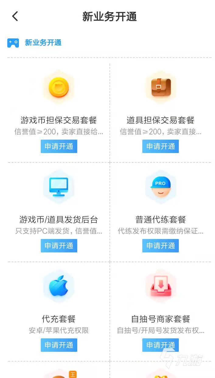 當(dāng)然,除了能夠在交易貓app當(dāng)中購買到各種cf賬號以外,想要通過cf來進行代練接單的玩家,也是可以直接得到滿足的。大家注冊好了交易貓app的賬號之后,進入到賣家管理頁面中選擇新業(yè)務(wù),在新業(yè)務(wù)內(nèi)申請開通普通代練資格即可。成功通過申請后,玩家們就可以在平臺內(nèi)進行代練接單了。