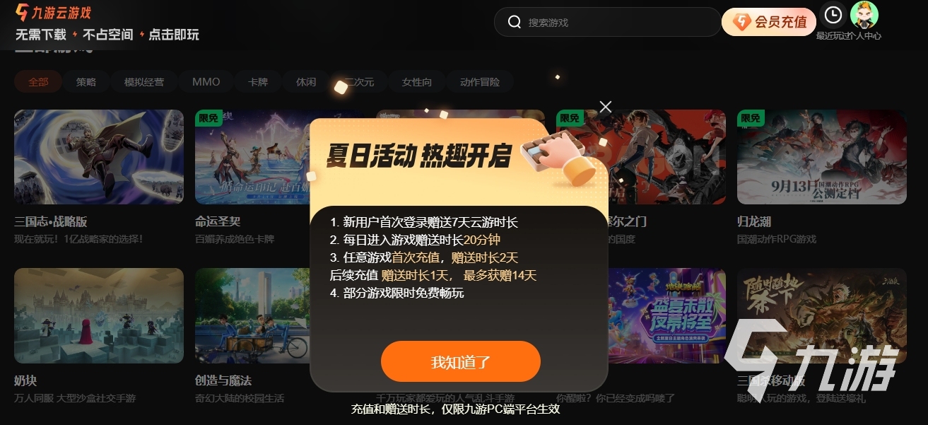 使用九游這個平臺來體驗,主要是因為其支持的游戲種類豐富,并且在福利方面也相當(dāng)?shù)慕o力,目前玩家每日進(jìn)入游戲都能得到20分鐘免費(fèi)的試玩時間贈送,此外對于那些首次登陸的玩家,更是可以直接獲得7天的免費(fèi)試用機(jī)會,提前了解游戲的內(nèi)容和玩法,如果是打算長期體驗的朋友,自然也是免不得對游戲進(jìn)行充值,而首次充值任意游戲都能得到兩天時長贈送,助力玩家更好地體驗游戲。
