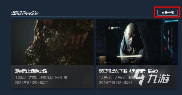 如圖所示,大家進(jìn)入steam的黑神話悟空游戲商品頁面,在頁面中部的【近期活動與公告】中可以看到最近的更新,因?yàn)橛螒蚰壳耙呀?jīng)上線了,之前的測試工具就沒有放在首頁展示了,大家點(diǎn)擊右上角的【查看全部】。