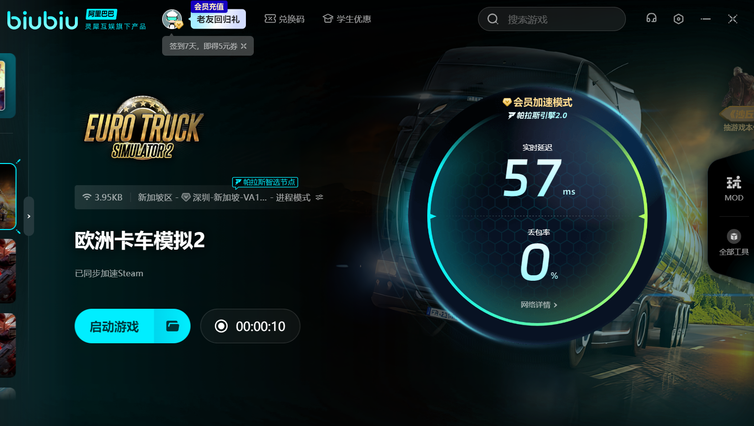 歐洲卡車模擬2支持Mod和多人聯(lián)機模式,聯(lián)機的過程中太卡的話,就有可能坑了隊友。這里建議用上biubiu,網(wǎng)絡(luò)變好后才能放心聯(lián)機,避免互相卡頓。對剛注冊的新人來講,就可馬上獲得24小時的免費加速。另外新老用戶通過兌換碼【biubiu不卡頓】,就能額外獲得三天免費加速。然后這還是一款國際大作,光靠正常網(wǎng)絡(luò)可能無法登陸。建議使用加速器,,網(wǎng)絡(luò)優(yōu)化后自然能享受全新的卡車世界。