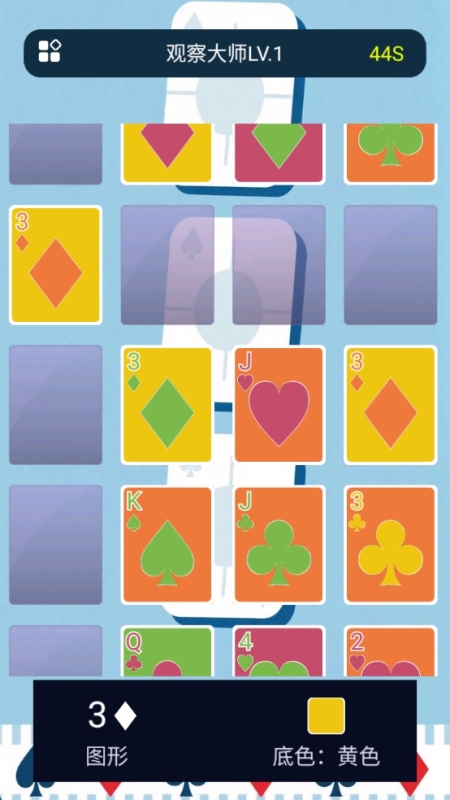 一個(gè)專(zhuān)門(mén)鍛煉觀察力和記憶力的休閑益智手機(jī)游戲,游戲玩法非常簡(jiǎn)單,就是卡牌配對(duì)消除,展示環(huán)節(jié)記住卡牌位置和圖案,然后翻牌找出相同兩張完成消除。游戲難度會(huì)從4張牌慢慢加到16張牌,而且展示環(huán)節(jié)的時(shí)間還會(huì)縮短,背景也會(huì)增加動(dòng)態(tài)元素干擾玩家進(jìn)行記憶,卡牌的正面有多種主題可以選擇,從撲克到日常物品、動(dòng)物圖標(biāo)都有。