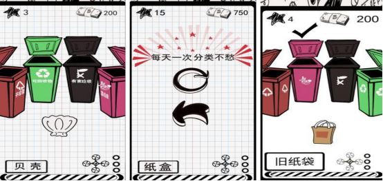 垃圾分類,從我做起,游戲的屏幕上方會有4個不同的垃圾桶類型,而垃圾桶上又有相應的字體,有害垃圾或可回收垃圾,闖關時隨機出現(xiàn)大量的垃圾,既有圖面的顯示,又有文字的代表,看到這些垃圾時,正確拖放在有效的垃圾桶中就算輕松獲勝。一旦分類錯誤之后就會被罰款。除了這些可看見到的垃圾以后,還有很多隱形垃圾。