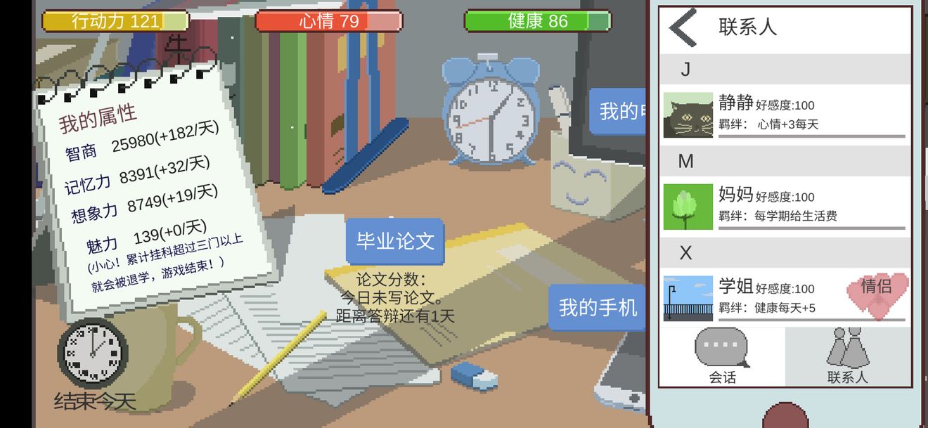 BUFF:+心情,+想象力,+金錢,+好感。優(yōu)先心情,前中期,可以做一下想象力也可以,大四基本就是刷心情。