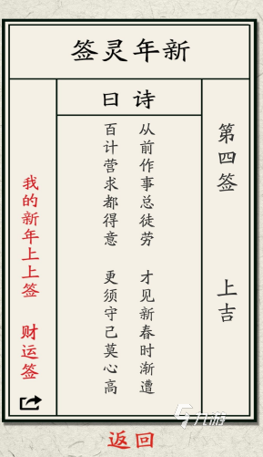 這是一款充滿趣味的新年求好運抽簽小游戲。玩家能夠體驗算命抽簽的樂趣,它模擬了現(xiàn)實中求簽的操作流程,借助大家都很熟悉的抽簽玩法,開啟別具一格的玩家問我答互動內(nèi)容。游戲以文字為核心元素,深入挖掘并傳承了中華傳統(tǒng)文化,讓玩家在游戲中感受傳統(tǒng)文化的魅力。針對不同的玩家,游戲會隨機給出不同的簽位,這種不確定性為游戲增添了許多趣味和驚喜。