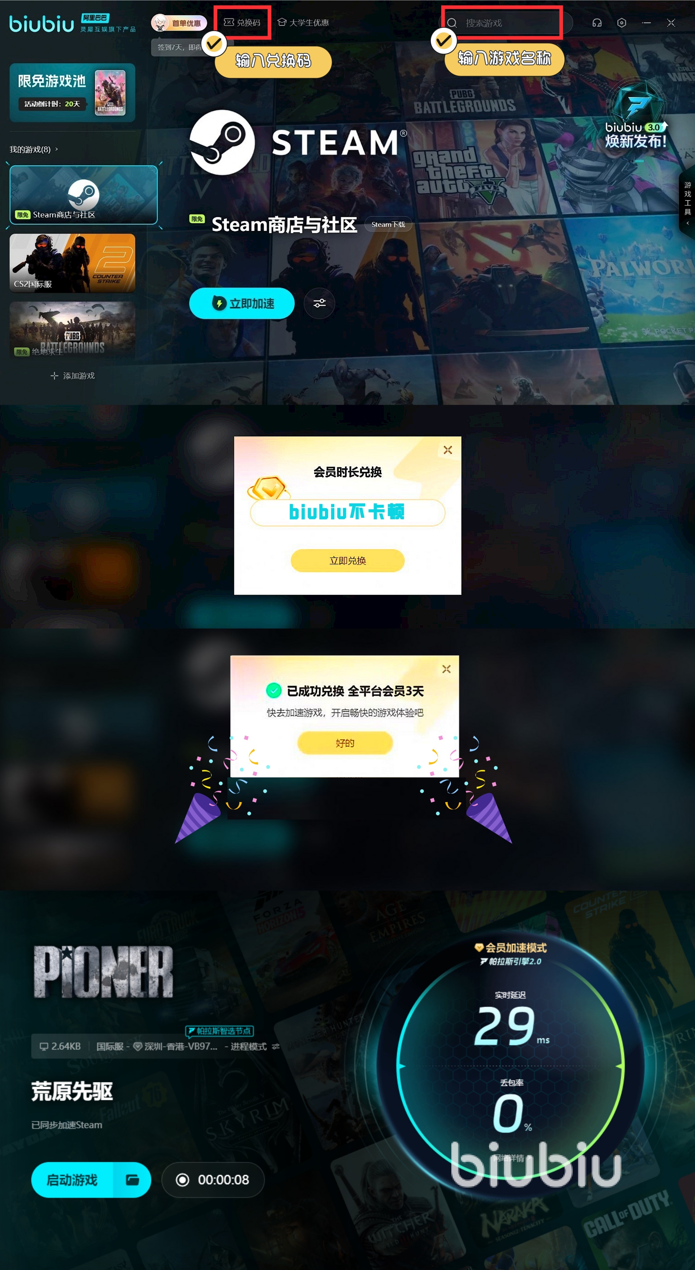 如果玩家想要去解鎖更多加送福利,那么還可主動輸入【biubiu不卡頓】,這樣就能額外獲得72小時,對于廣大新用戶來說,累計可獲贈96小時加速支持。