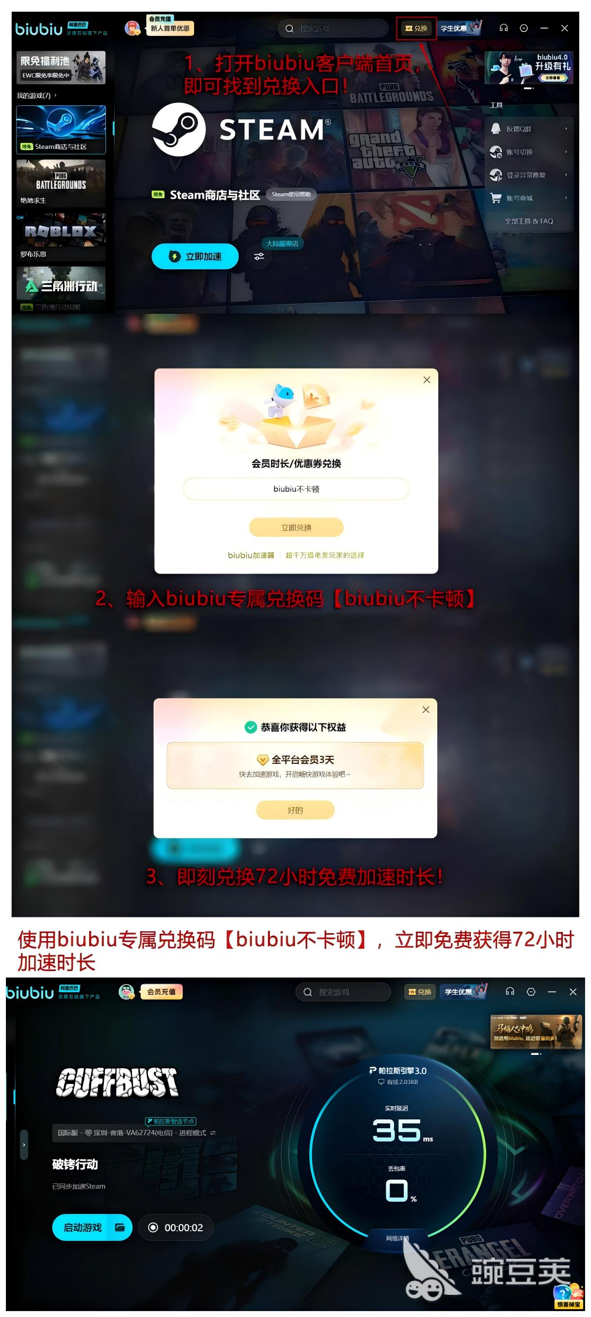 在【兌換】頁(yè)面輸入口令【biubiu不卡頓】,即可領(lǐng)取3天免費(fèi)加速時(shí)長(zhǎng),并且如果是新用戶注冊(cè)使用,還可額外獲得24小時(shí)福利時(shí)間,合計(jì)可達(dá)96小時(shí)免費(fèi)體驗(yàn)期。將加速器掛機(jī)運(yùn)行,能有效降低延遲與丟包率,暢享穩(wěn)定流暢的多人聯(lián)機(jī)樂(lè)趣。
