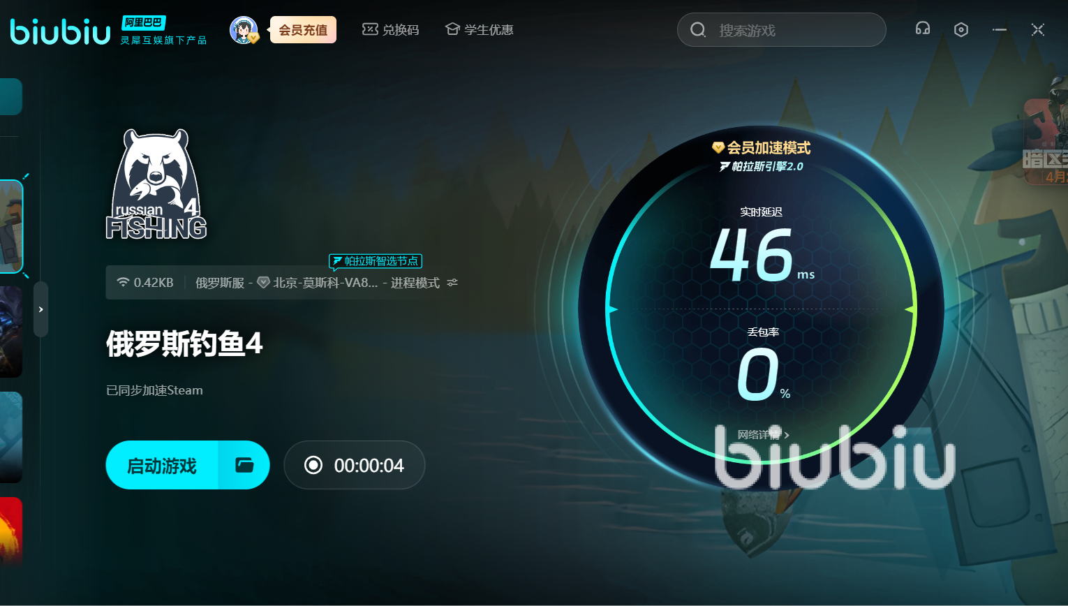 由于俄羅斯釣魚4屬于一款聞名遐邇的海外佳作,所以暫時(shí)仍然沒(méi)有上線國(guó)服。為了能夠來(lái)到這個(gè)世界釣魚,大家用上biubiu,加速過(guò)后才能注冊(cè)自己的賬號(hào),開始真正的釣魚人生。對(duì)于新用戶來(lái)說(shuō),注冊(cè)之后就可以獲得24小時(shí)免費(fèi)加速。另外新老用戶輸入兌換碼【biubiu不卡頓】,就能額外獲得三天免費(fèi)加速。要是釣魚途中過(guò)卡的話,很容易讓大魚脫鉤。所以要借助加速器,才能準(zhǔn)確釣到每一只不同品種的魚。
