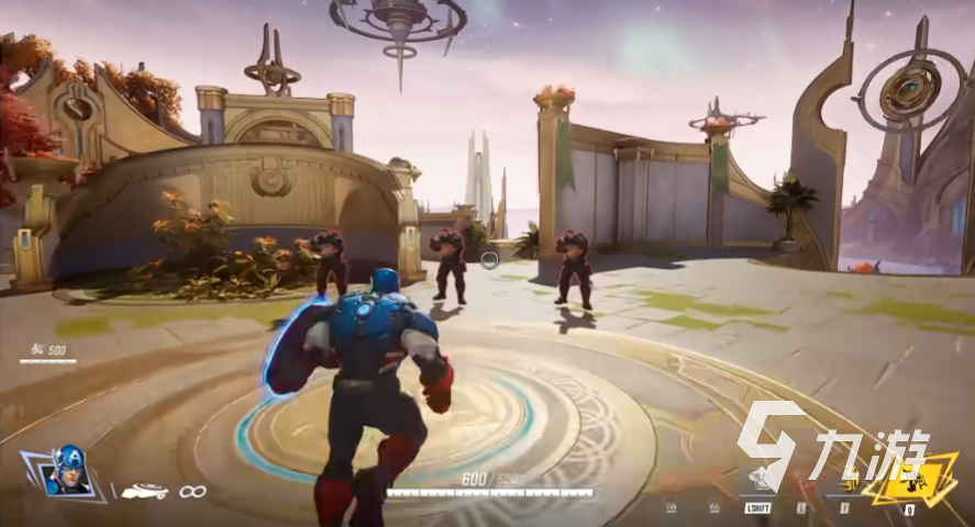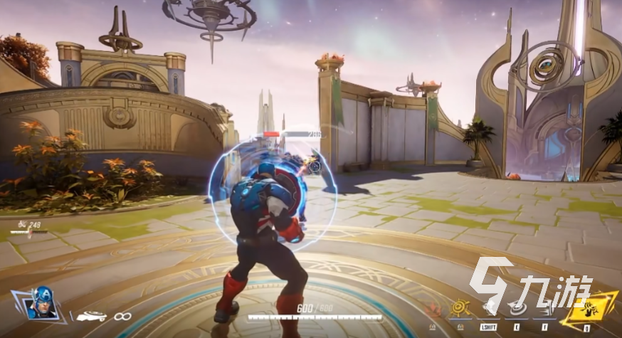 shift技能的話,又可以提升自身的移動速度并高高躍起,是個很好用的突進技能。另外還有E技能,用了之后就可以讓它將盾牌投擲出去,砸中敵人后會造成高額傷害。F技能的話,就能讓他舉起盾牌并向著前方?jīng)_刺,讓他猶如破竹之勢一般沖破敵人的防御。