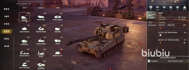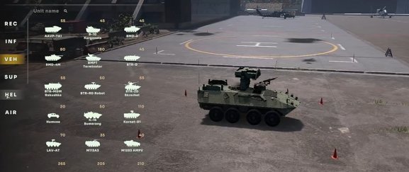 在偵查欄里的載具有偵察車、直升機(jī)、輕型裝甲以及坦克,可以用來看視野。裝甲欄基本都是載具,比如輕型裝甲、步戰(zhàn)車和坦克,主要負(fù)責(zé)支援步兵進(jìn)攻或者防守。支援欄有運(yùn)輸車和伴隨防空車,都是用來后方支援的。