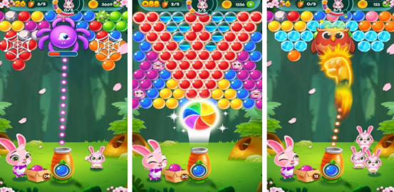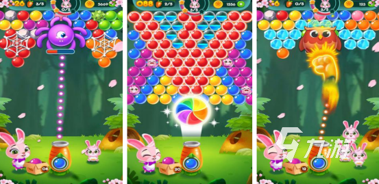 將可愛的小兔子與泡泡龍相結(jié)合,小兔子通過射擊泡泡,發(fā)射泡泡的方式將夢幻的泡泡消除。在規(guī)定的時間內(nèi)全部消除才能夠成功通關(guān)。游戲當中有很多非??蓯鄣男游?,比如章魚,又或者是貓頭鷹等等。這些都會給你造成一系列障礙,玩家要利用智慧頭腦將其打敗。