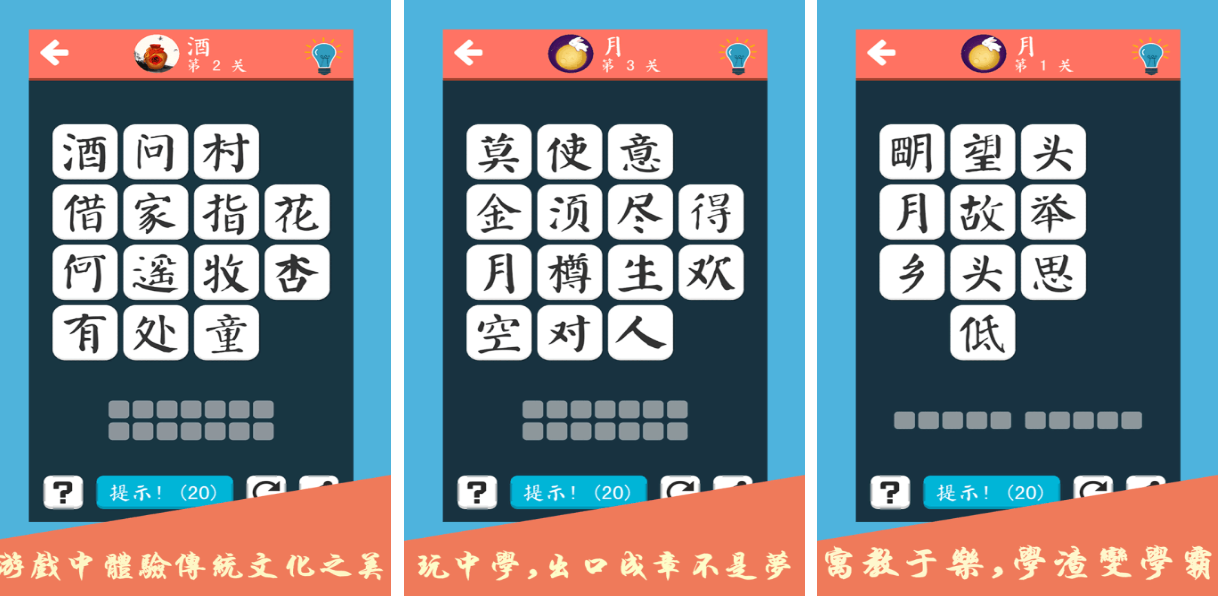 詩詞大會(huì)飛花令是幫助大家認(rèn)知各種古代詩詞的硬核手游,詩詞歌賦的知識(shí)基本上會(huì)在本作中融會(huì)貫通,玩法也是寓教于樂展現(xiàn)出古代詩詞的精髓,填寫漢字讓詩詞歌賦完整的游戲玩法個(gè)性鮮明,幾乎每個(gè)朝代的詩詞歌賦都會(huì)在游戲中呈現(xiàn),借此機(jī)會(huì)大家會(huì)了解到詩人創(chuàng)作時(shí)的心情,歡迎小學(xué)生玩家進(jìn)入本作學(xué)習(xí)詩詞方面冷知識(shí)。