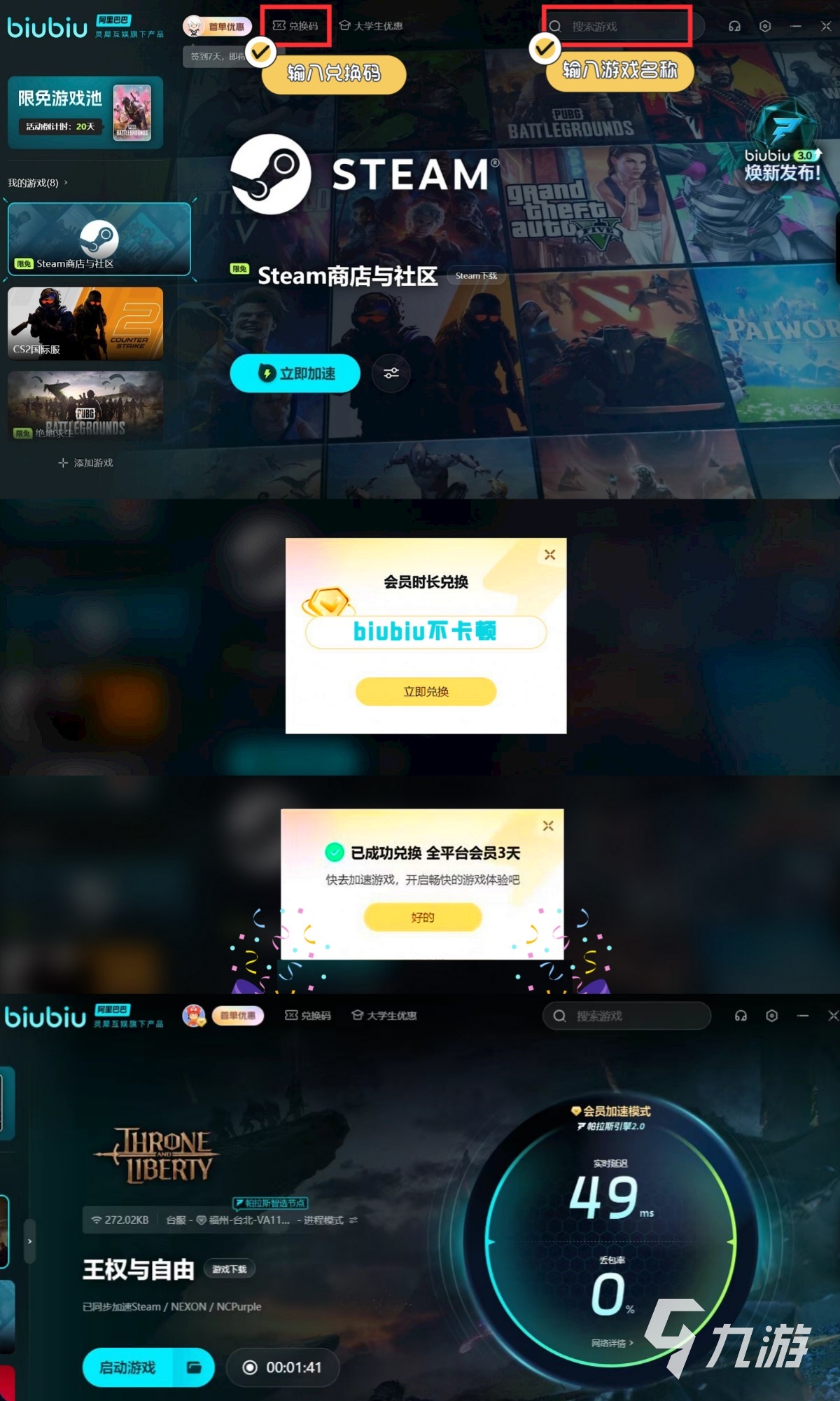 如果需要更多的加速機(jī)會(huì),大家只需去點(diǎn)擊兌換,然后輸入口令【biubiu不卡頓】,就可以領(lǐng)取72h的加速機(jī)會(huì)。這個(gè)福利新老用戶都適用,而新用戶則是能得到3+1天的加速機(jī)會(huì)。