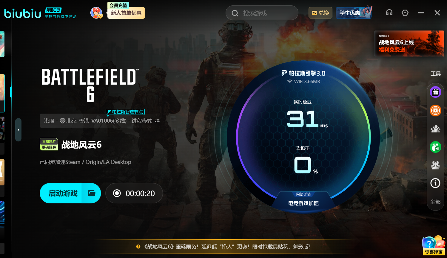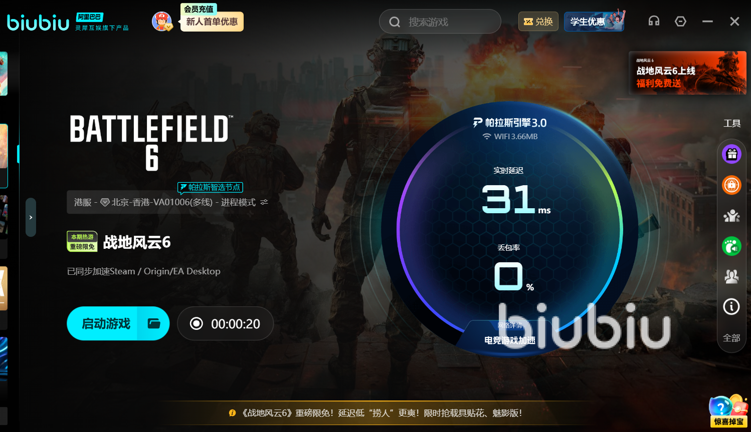 尤為值得一提的是,biubiu加速器正對戰(zhàn)地系列開展極具誠意的限免活動:針對戰(zhàn)地系列游戲(包括《戰(zhàn)地6》)開放限免通道,10月1日0點起至10月20日,體驗穩(wěn)定低延遲激戰(zhàn),在參與限免活動期間,更有機會參與抽獎,免費抽取戰(zhàn)地風(fēng)云6魅影版。此外對于初次接觸biubiu的新用戶將獲得豐厚啟動禮遇,注冊賬號后系統(tǒng)即時自動奉上24小時加速資格,此外輸入【biubiu不掉線】即可繼續(xù)享用加速特權(quán)72小時,這樣合計擁有長達96小時的免費加速時長。