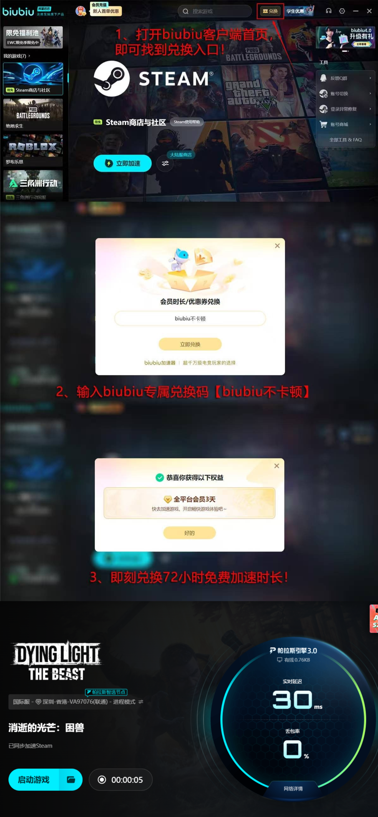 此外,該應(yīng)用還提供了不少福利,比如新用戶注冊即可領(lǐng)取24h免費(fèi)時(shí)長,這是平臺(tái)專為新人準(zhǔn)備的超值福利,此外,全體用戶只需在指定區(qū)域輸入口令【biubiu不卡頓】,還能額外獲得72h免費(fèi)提速權(quán)限,這一組合福利大幅降低了體驗(yàn)門檻,讓新用戶有更充足的時(shí)間全面測試加速效果,盡情感受游戲在穩(wěn)定網(wǎng)絡(luò)中的流暢表現(xiàn)。