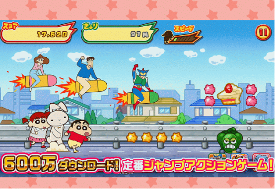 根據(jù)很多人童年時美好的記憶,動畫片蠟筆小新改編而來,也是由日本公司所打造,所以里面的文字并沒有進行漢化處理,不過并不影響玩家的體驗,可以通過解鎖的各種原著中的角色,開啟一段冒險之旅。在蠟筆小新,與父母甚至是小伙伴,共同的在城市里面,穿梭的時候會遇到很多的障礙,甚至是對手,所以必須要通過合理的走位,才能解決。