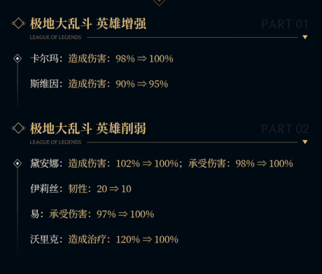 極地大亂斗玩法也是有了調(diào)整,卡爾瑪以及斯維因是迎來(lái)了增強(qiáng),傷害百分比得到了提升,戴安娜傷害以及承傷效果都被削弱了,伊莉絲韌性從20下調(diào)到了10,沃里克的治療量也是從120%下降到了100%。