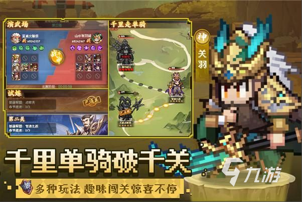 一個(gè)三國(guó)題材的像素風(fēng)卡牌放置手游,玩家可以通過(guò)抽卡、做任務(wù)收集魏蜀吳群四個(gè)陣營(yíng)的武將,然后搭配出不同流派陣容,武將可以通過(guò)升星、強(qiáng)化裝備和技能等方式進(jìn)行培養(yǎng),支持無(wú)損換將。戰(zhàn)斗可以全自動(dòng)掛機(jī)也可以直接一鍵跳過(guò),而且支持離線玩法,上線可以直接收取資源。游戲副本還原了官渡之戰(zhàn)等很多經(jīng)典三國(guó)戰(zhàn)役,也有跨服和天梯戰(zhàn)等pvp玩法。