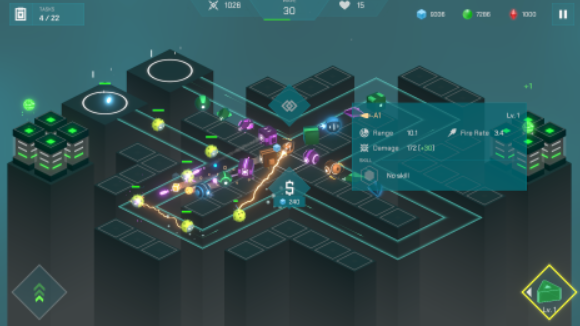 十字防守以簡(jiǎn)潔大氣的3D賽博風(fēng)格為視覺(jué)基調(diào),充滿未來(lái)感的金屬質(zhì)感場(chǎng)景、線條流暢的炮臺(tái)造型以及霓虹閃爍的特效光影,營(yíng)造出獨(dú)特的科幻塔防氛圍,核心玩法圍繞隨機(jī)建造與合并機(jī)制展開(kāi),玩家需要利用有限的初始資源建造基礎(chǔ)炮臺(tái),通過(guò)將兩個(gè)相同等級(jí)、相同類(lèi)型的炮臺(tái)進(jìn)行合并,隨機(jī)生成更高等級(jí)的炮臺(tái)。