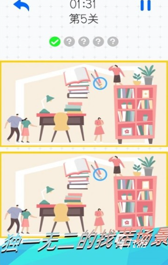游戲以精致細(xì)膩和色彩明快的手繪風(fēng)格畫面,瞬間捕獲玩家的目光。游戲中蘊藏著大量精心設(shè)計的關(guān)卡,每一關(guān)都等待著玩家的耐心探索,只有找出所有細(xì)微差別,才能順利解鎖下一輪挑戰(zhàn)。關(guān)卡設(shè)計豐富多彩,每一張圖片都藏著不一樣的驚喜,等待著玩家體驗一場場新穎的找茬盛宴,感受那份只屬于尋異趣玩的獨特快感。游戲還配備了輕松愉悅的背景音樂和恰到好處的音效,它們可以撫平玩家一天的疲憊與緊張,讓玩家在享受游戲的同時,也能得到心靈的放松。