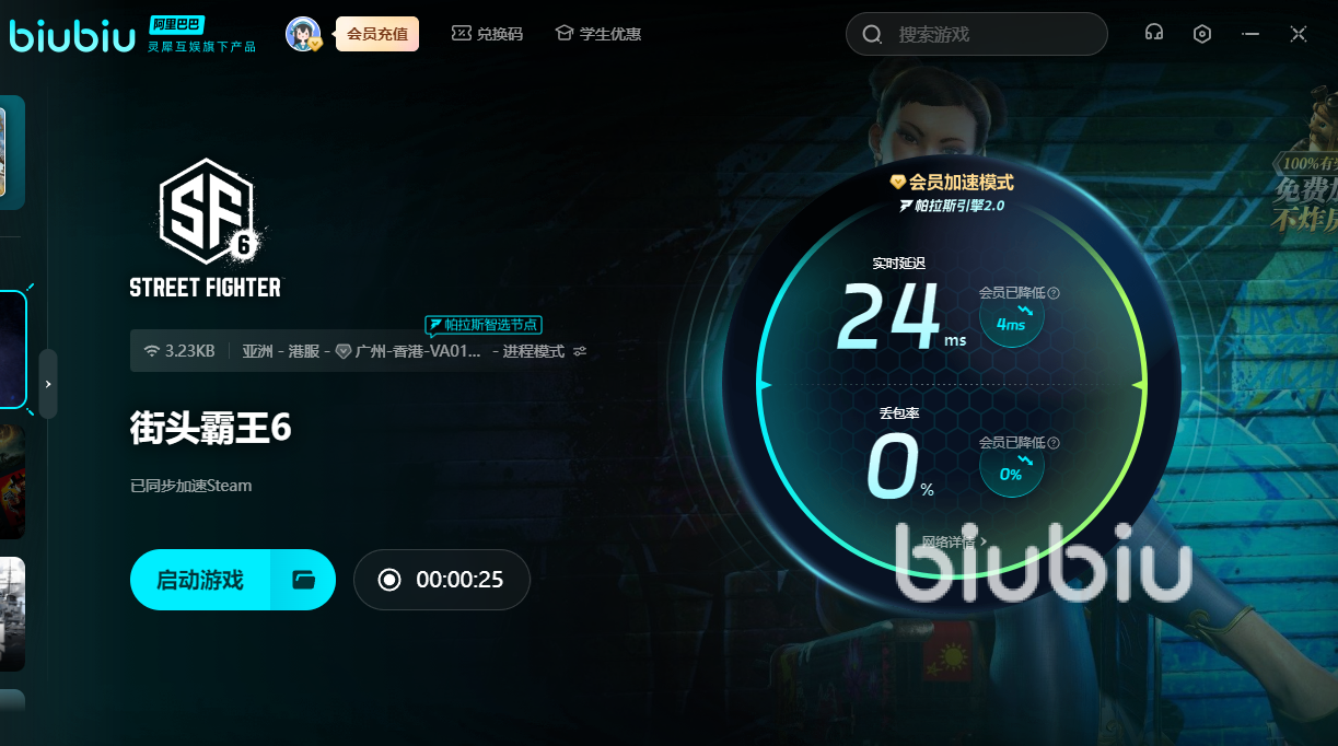 街頭霸王6作為享譽(yù)全球的格斗佳作,所以暫時還沒有上線國服??蓵r我們?yōu)榱嘶沓蔀樾碌母穸芳遥蒙蟗iubiu,方可參加國際舞臺之間的格斗較量。對于新用戶來說,可獲得3小時的免費(fèi)加速。另外新老用戶輸入【biubiu不卡頓】,就可額外領(lǐng)取三天免費(fèi)加速。如果使用春麗戰(zhàn)斗時太卡,就無法展現(xiàn)出多變的技能以及招式。用上加速器后,還可以徹底摸清角色以及敵人的套路,更快打出連招。