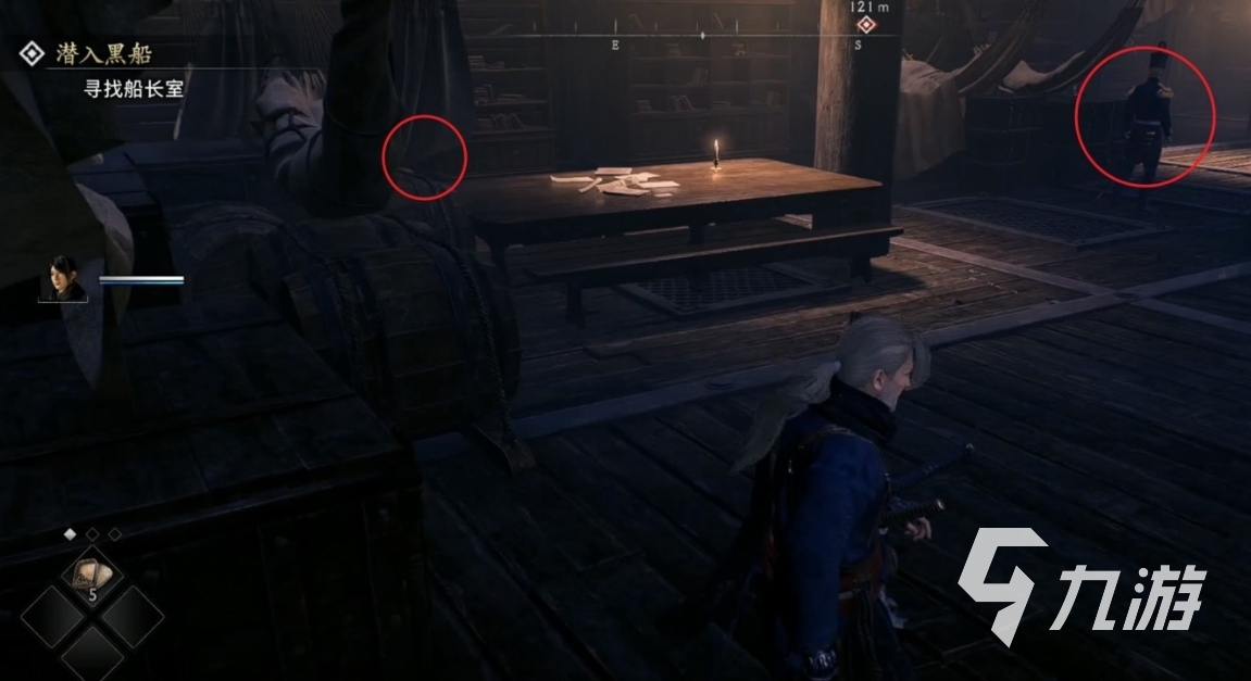 在大家照亮小船上的旗幟后,就可直接跳入海中并向黑船游去,在附近玩家會發(fā)現(xiàn)兩個敵人正在巡邏,此時悄悄地靠近小船,等待敵人身上出現(xiàn)紅圈,然后就按三角鍵進行暗殺即可,然后向小船的左側看去,利用R2鍵使用鉤爪躍上黑船,在玩家登上甲板后,會遇到另外兩名敵人,擊敗后點亮旁邊的旗幟,沿著旗幟右側的樓梯下去,樓梯口附近有三個敵人,前方區(qū)域有兩個,左側桌子后方還有一個,由于這些敵人大多背對著大家的,所以可悄悄潛行到身后進行暗殺。