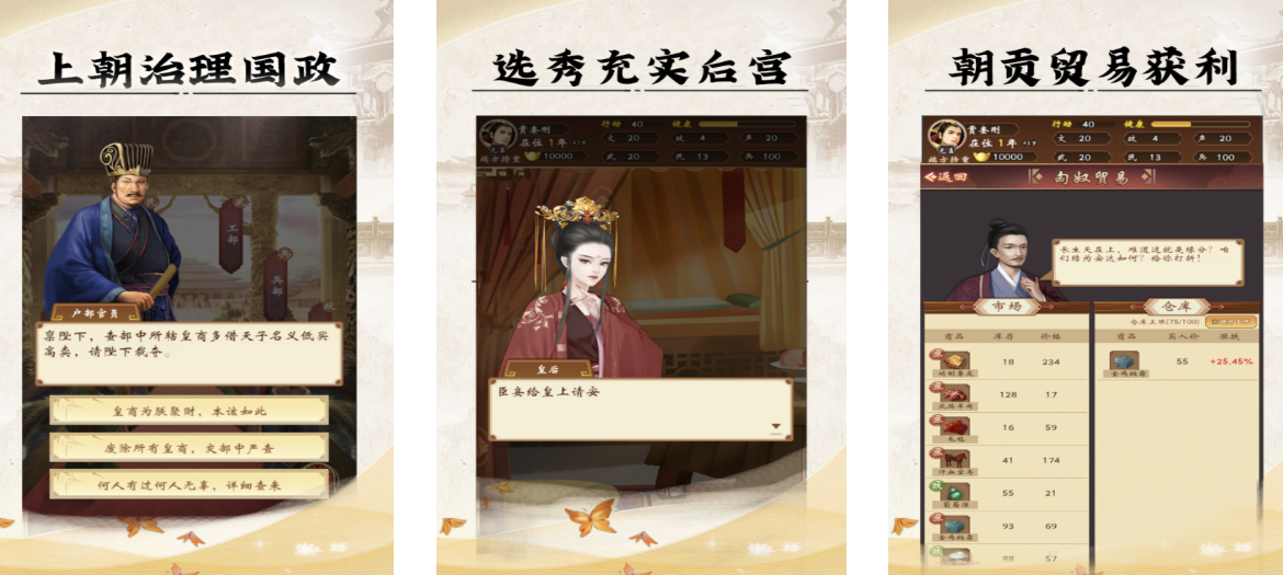 在事業(yè)上,作為一名皇帝,玩家需要一心用在如何高效處理朝政,這一行為既可以為玩家理清當今朝代中時局的變化,玩家可以根據時局變化作出自己的決策,還可以為以后打造的太平盛世做鋪墊。與此同時,玩家可以根據朝代特色擴充后宮,流水的妃子,鐵打的皇帝。另外,玩家還可以進行貿易交易,從中獲利。
