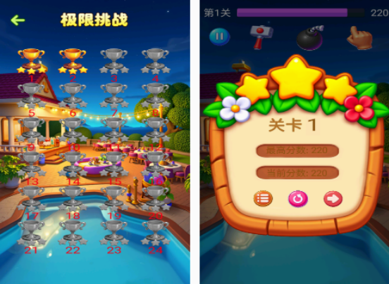 這是各種場合都能玩的休閑游戲,也是以簡單的消除玩法為主,在每個關卡中的玩家,都可通過點擊相同的圖片進行消除,含有豐富的道具,無論是炸彈或者是其他的,你都需要根據(jù)自己游戲的過程當中,正確的選擇,助你一臂之力。在每個關卡中,都會根據(jù)玩家所獲得的分數(shù),獲得不同的星星數(shù)量,想要挑戰(zhàn)高分的話,你要盡可能的發(fā)揮自己的實力。
