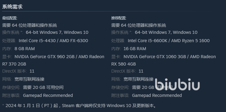 目前我們登錄steam,已經(jīng)可以看到相關(guān)商店頁面,下拉到末尾,展示了相關(guān)配置給大家。若是不在乎畫質(zhì),只想運(yùn)行,擁有i5-4430的處理器,搭配gtx960的顯卡,留夠20GB存儲(chǔ)空間,以及8GB的運(yùn)行內(nèi)容就夠了。想開好一點(diǎn)的畫質(zhì),就要進(jìn)行升級(jí),將處理器提升到i5-6600k的水平,然后運(yùn)行內(nèi)存提升到16GB,顯卡要用gtx1060以上的。還想再高,就上不封頂,全看玩家想升級(jí)多高的配置。