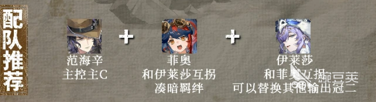游戲當中的范海辛,他不僅有一定的遠程輸出能力,他在團隊里一名還可以帶來很強的控制以及爆發(fā)效果,在游戲當中,范海辛除了在輸出效果上面有一些高頻率的遠程攻擊能力之外,其實站樁輸出效果也是非常不錯的,目前在他本身的技能機制里面,其實這個角色是可以跟一些槍械型角色一起上陣的,因為畢竟他也是作為一個槍械型屬性的角色使用的,那么如果進行配對的話,建議大家可以將它跟菲奧還有伊萊莎一起組成一個陣容,這樣陣容里面的主要核心就是范海辛了。