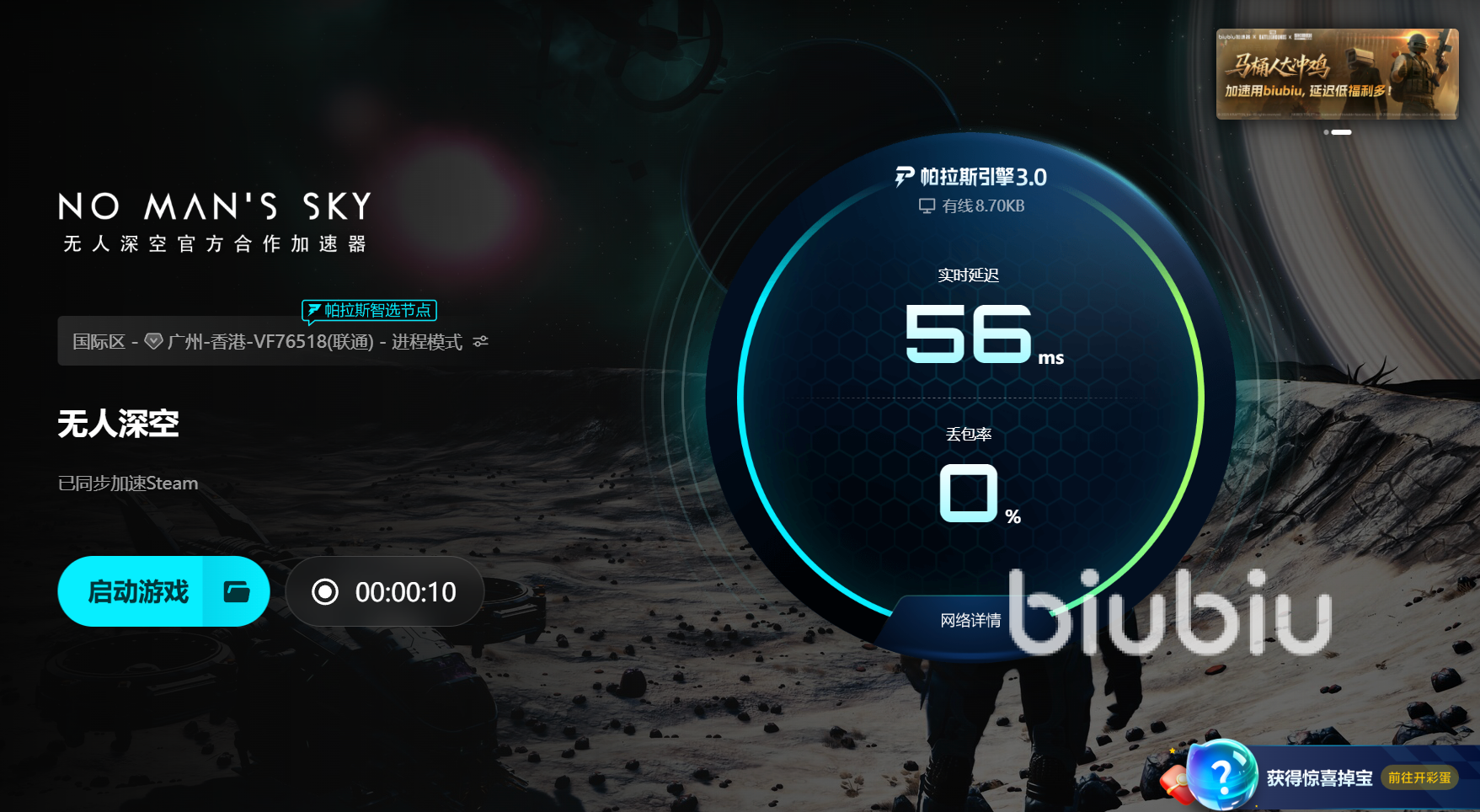 為了讓每一位玩家都能順利進(jìn)入游戲世界,biubiu加速器為所有用戶提供穩(wěn)定福利。注冊后即可立即獲得24小時(shí)加速時(shí)長。所有用戶都可以在客戶端輸入口令【biubiu不卡頓】還能額外獲得72小時(shí)。這意味著你可以在完整的四天時(shí)間里專注探索星系、登陸行星、建造基地,不用擔(dān)心游戲剛啟動就被彈回桌面,這不是臨時(shí)活動,而是所有用戶都能擁有的穩(wěn)定保障。biubiu體驗(yàn)官、冠軍選手左梓軒親自參與調(diào)優(yōu)測試,他在高峰時(shí)段反驗(yàn)證網(wǎng)絡(luò)穩(wěn)定性,確保即使在多人共享線路時(shí)也能保持順暢連接,不再出現(xiàn)啟動就閃退的問題。