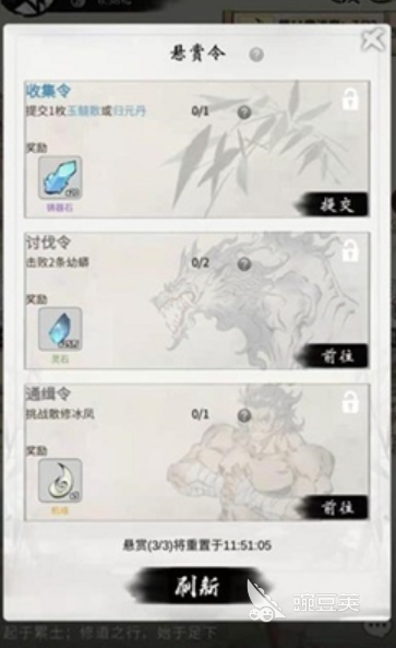 游戲每日可以接取三個(gè)懸賞,同時(shí),每日可以免費(fèi)刷新一次懸賞內(nèi)容,懸賞包含有通緝令、討伐令、收集令等等,在玩家完成了懸賞任務(wù)時(shí),不僅可以獲得靈石的資源,也能夠獲取游戲內(nèi)珍稀的勾玉,用于購(gòu)買法寶。