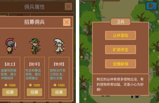 一個單機類型的像素風掛機游戲,在游戲中你就可以招募不同職業(yè)的傭兵,把這些傭兵組合在一起。游戲還會帶有一些隨機肉鴿的玩法,不需要聯(lián)網,你可以通過掛機的方法讓他們自動的打副本或者是做任務。因為是純單機的,所以無論你想要培養(yǎng)什么樣的隊伍都行,你不需要去和其他人比進度,因此也沒有什么太大的壓力,在摸魚的時候你還可以隨意的調整一下陣容。